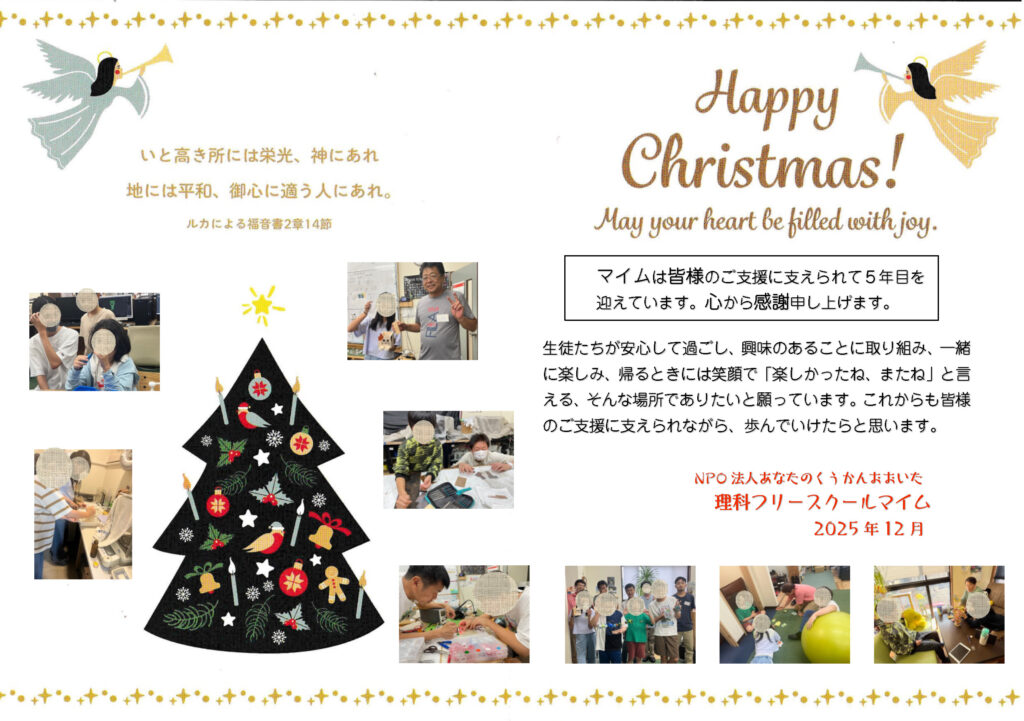 2025-12-24 / 最終更新日時 : 2025-12-20 コニー NPO活動 Merry Christmas to you Merry Christmas to you. 今年もホームページでマイム科学創楽クラブの活動をご覧いただき、本当にありがとうございます。(^^)皆さまのあたたかい応援に支えられ、子どもたちが「やってみたい!」と思うことに楽しく挑戦できる一年となりました。心より感謝しています。これからもどうぞよろしくお願いいたします。 マイム科学創楽クラブ スタッフ一同